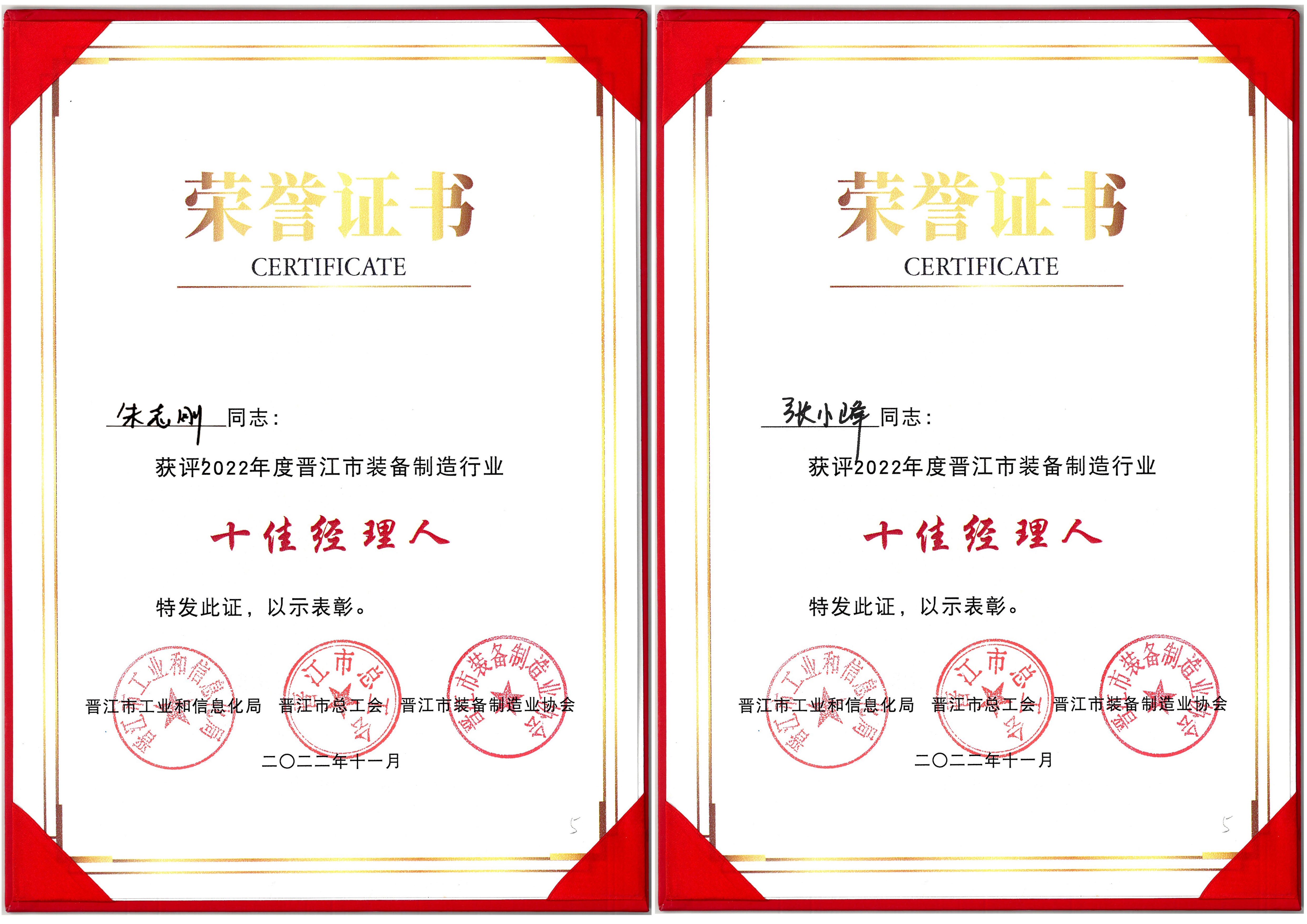 تم اختيار تشانغ شياو فنغ وتشو تشي قانغ كأفضل عشرة مديرين في الصناعة من قبل جمعية المعدات الذكية في جينجيانغ